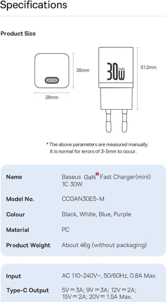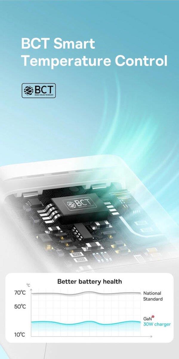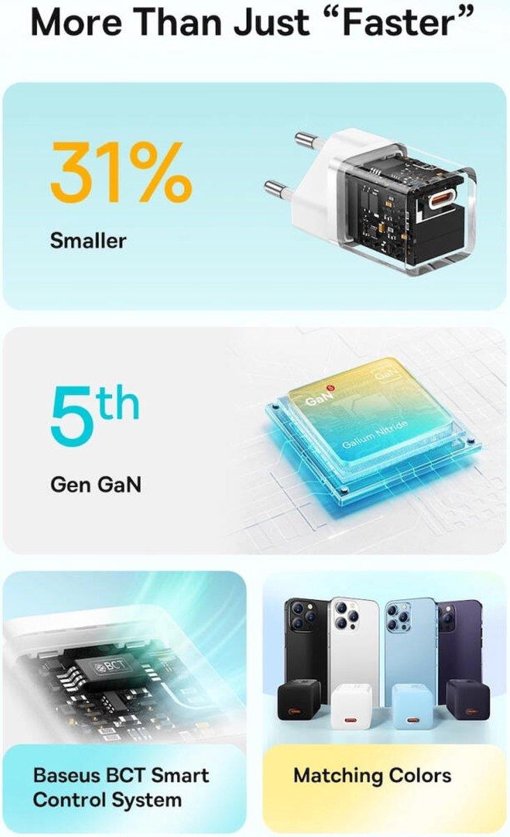 • Mini nabíječka Baseus je vybavena technologií GaN a inteligentním řízením teploty, které usnadňují použití a poskytují ochranu vašim zařízením.