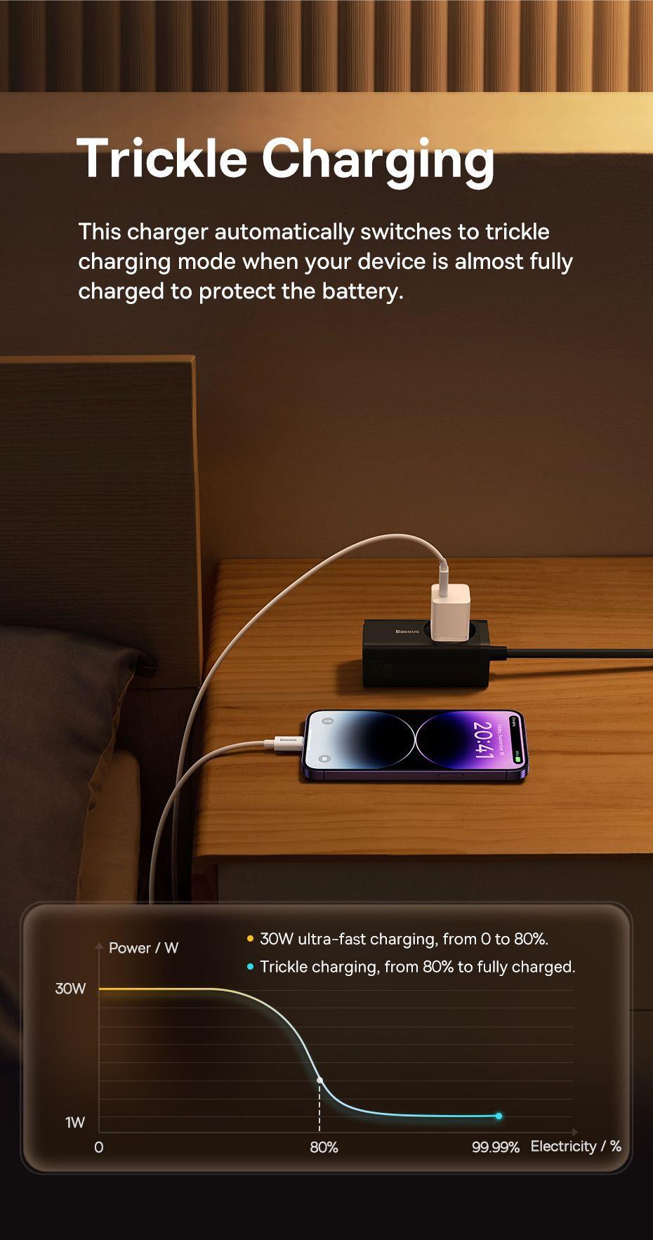 Nabíjíte často svá zařízení v noci? S Baseusem to můžete dělat bez obav! Miniaturní síťová nabíječka inteligentně rozpozná zbývající energii vašeho zařízení a automaticky přepne na záložní nabíjení. Díky tomu se vyhnete přebíjení a ochráníte svůj telefon přes noc!