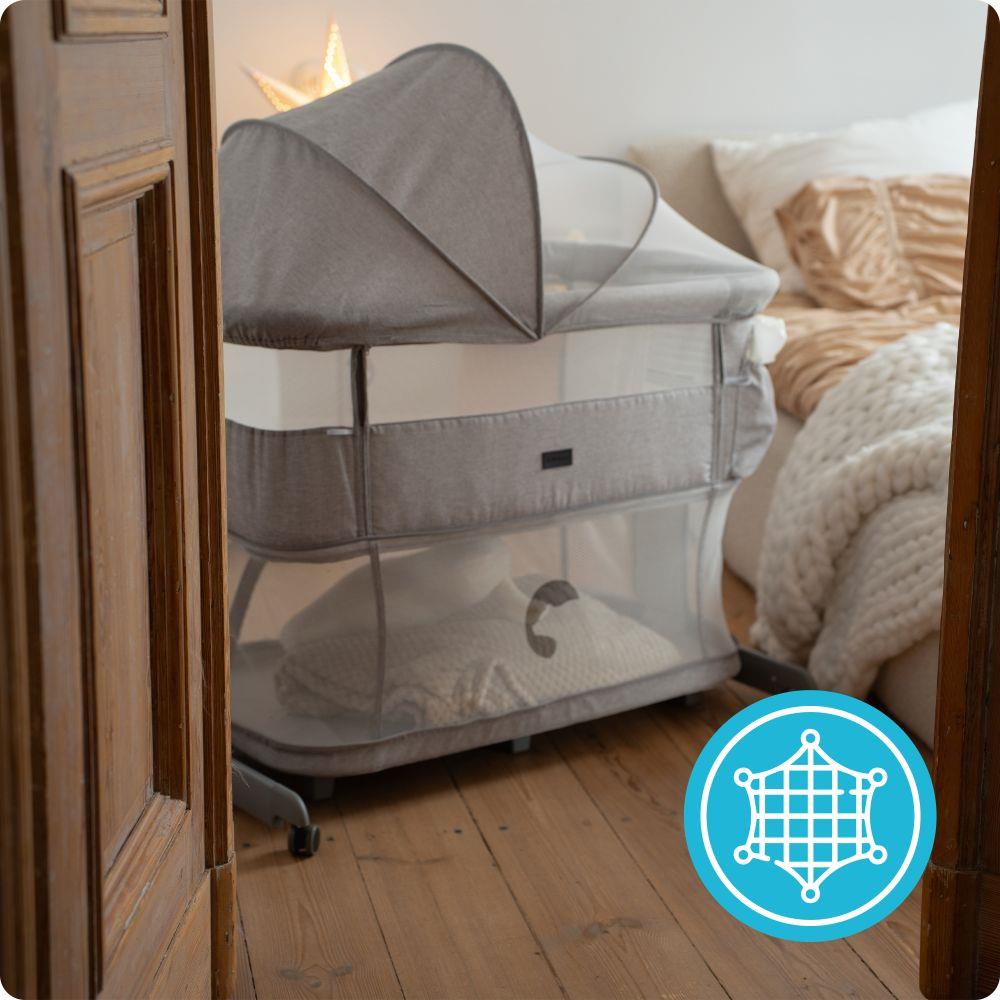 Boční strany postýlky jsou vyrobeny z jemné síťoviny, která zajišťuje optimální cirkulaci vzduchu a umožňuje rodičům mít miminko neustále na očích. Odolná tkanina OXFORD 300D je praktická na údržbu – snadno ji očistíte vlhkým hadříkem a postýlka tak zůstane krásná i při každodenním používání.