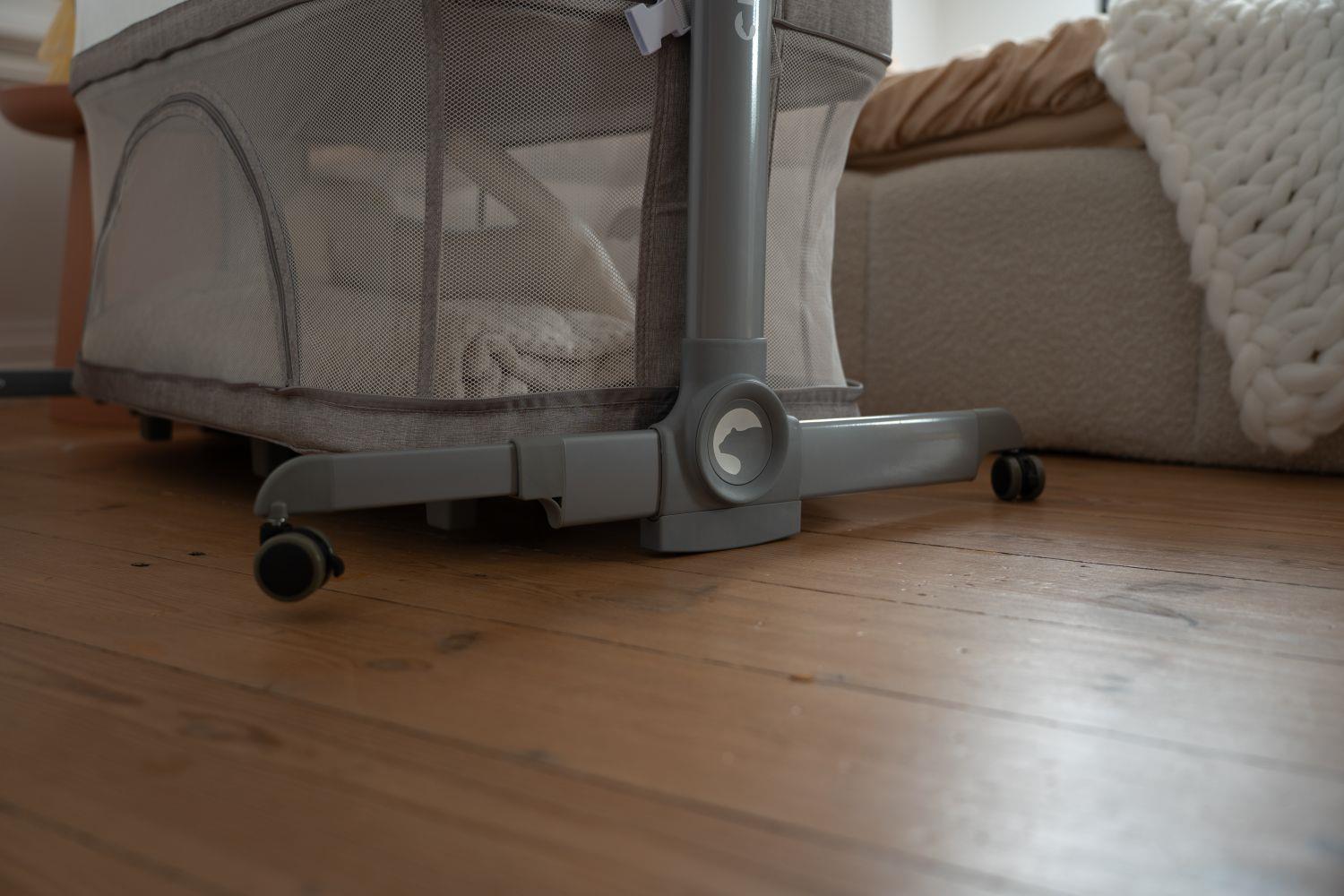 Postýlka je vybavena 4 kolečky s brzdami, díky nimž ji snadno přesunete po bytě přesně tam, kde ji zrovna potřebujete. Praktická boční kapsa poslouží na uložení drobností a boční vstup v režimu ohrádky umožňuje dítěti samostatně vylézat – podporuje jeho přirozený vývoj i samostatnost.
