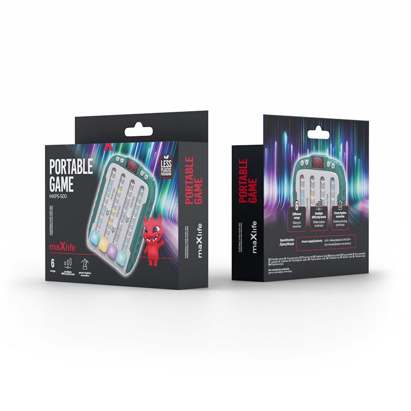 Maxlife MXPS-500 je přenosná rytmická hra navržená pro dynamickou zábavu a rozvoj motorických schopností. Zařízení umožňuje stisknout tlačítka v rytmu podsvícených sekvencí, čímž stimuluje reflexy, koncentraci a koordinaci rukou a očí. Díky šesti úrovním obtížnosti se hra přizpůsobuje schopnostem uživatele a nabízí postupně se zvyšující tempo a složitost světelných sekvencí.