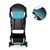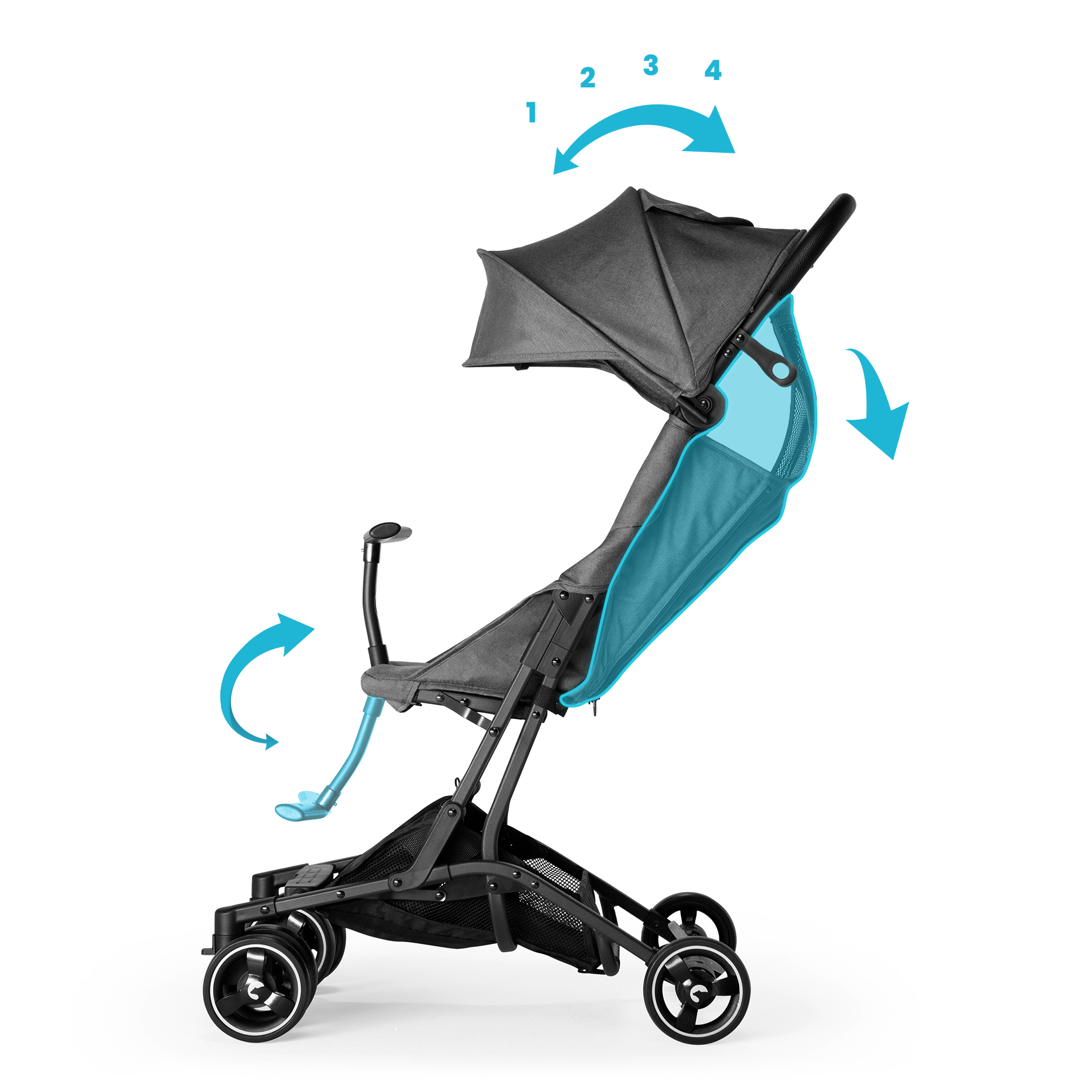 Úhel zádové opěrky kočárku lze nastavit do dvou stupňových úrovní. Kočárek má sklopnou bezpečnostní tyč, kterou lze použít i jako podnožku. Stříška kočárku je skládací do 4 úrovní a má síťované okénko.