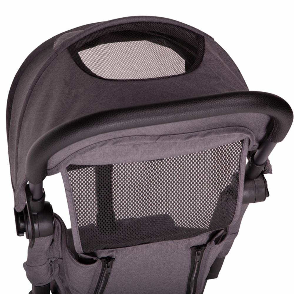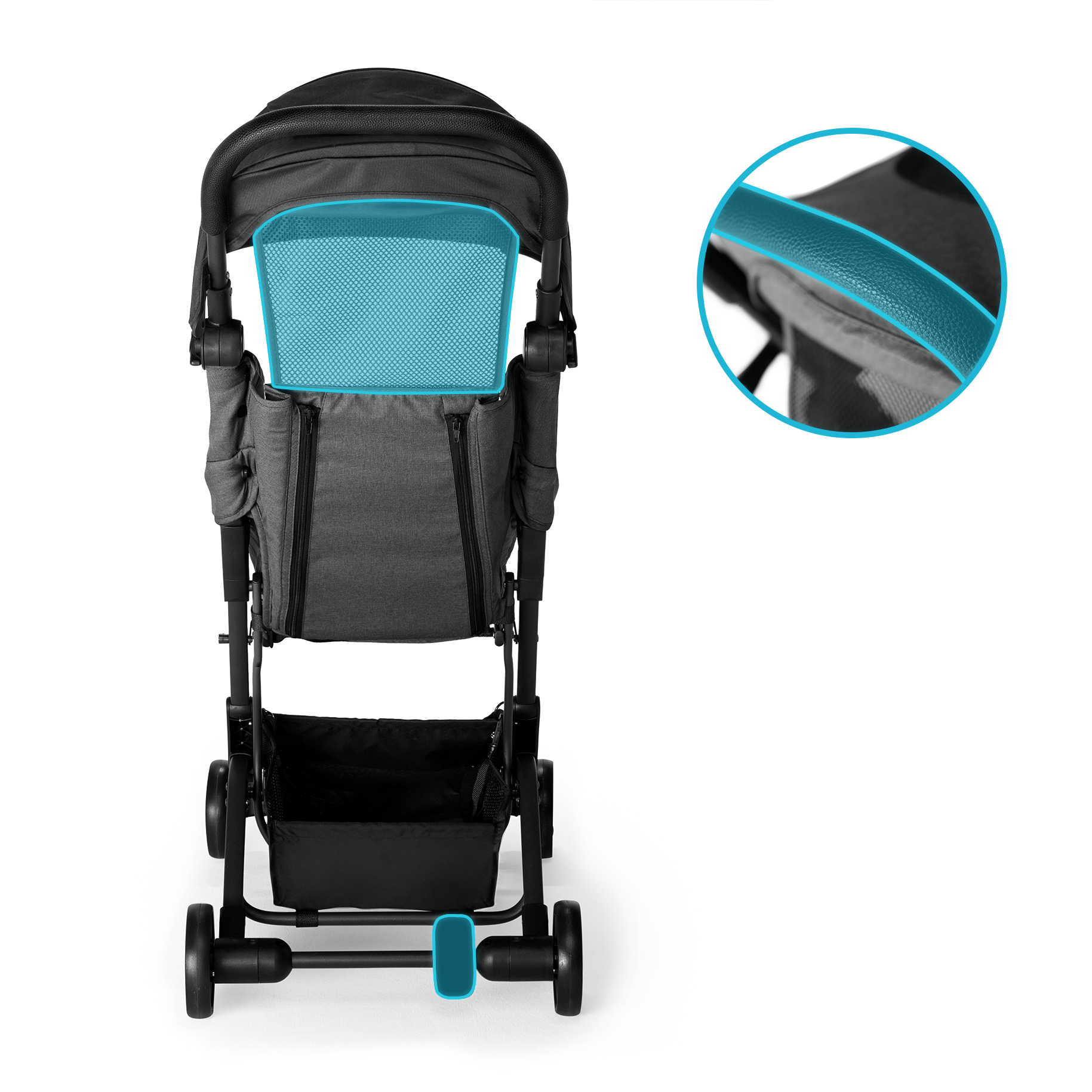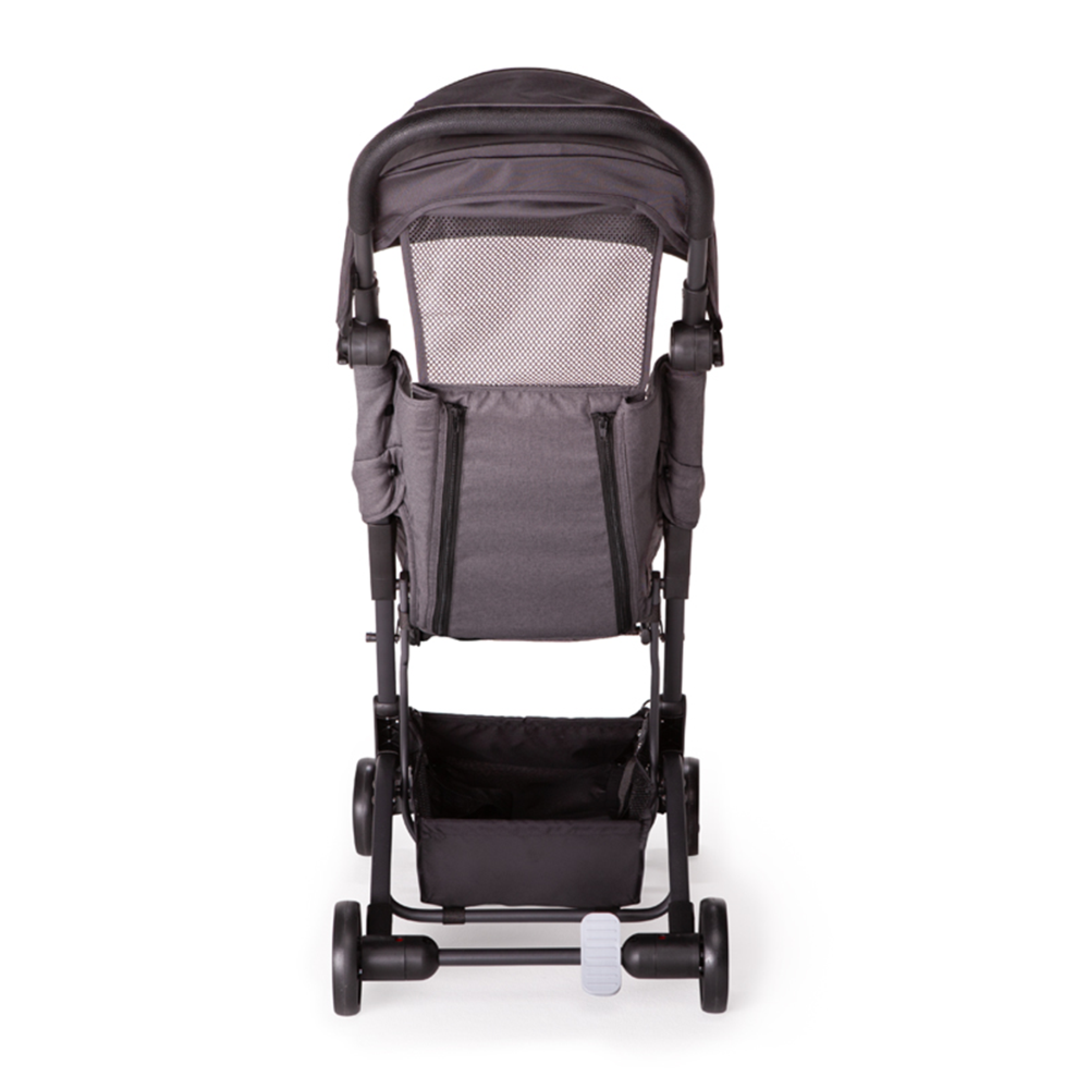 Velká síťovina umístěná v horní části zádové opěrky umožňuje větrání a kontrolu dítěte. Pohodlné řízení kočárku zaručuje rukojeť z ekokůže a i přes své malé rozměry je kočárek vybaven brzdou, která poskytuje další bezpečnost.