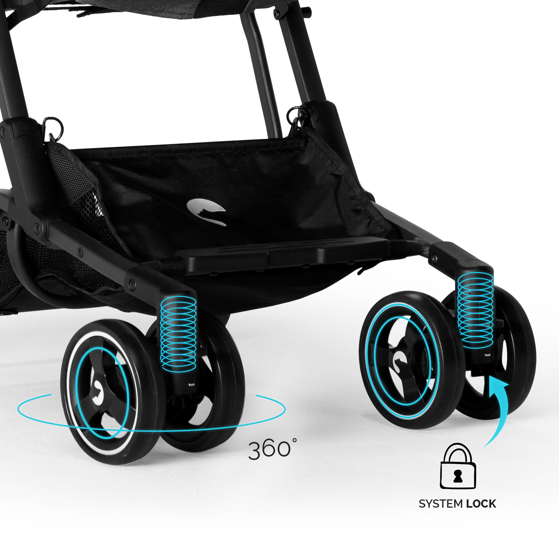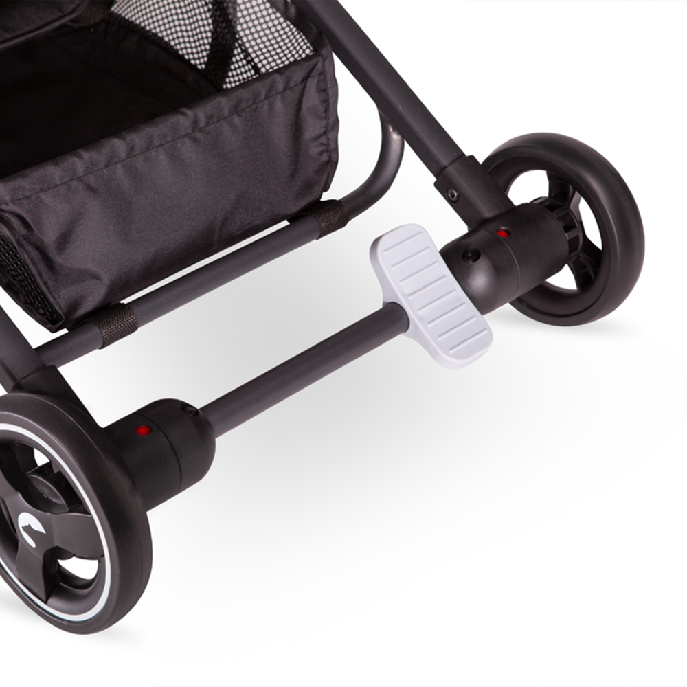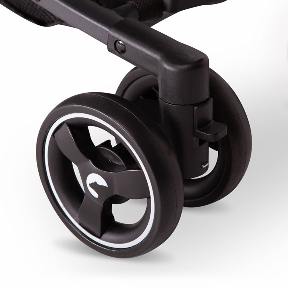 Kočárek má odpružení předních kol, což zajišťuje vysoký komfort jízdy pro dítě. Měkká EVA kolečka (přední a zadní, velikost 5,5") navíc snižují otřesy a nevyžadují pumpování. Pro pohodlnou přepravu lze všechna kolečka jednoduše odejmout. Přední kolečka jsou dvojitá a otočná o 360° a v případě potřeby je lze zaaretovat.