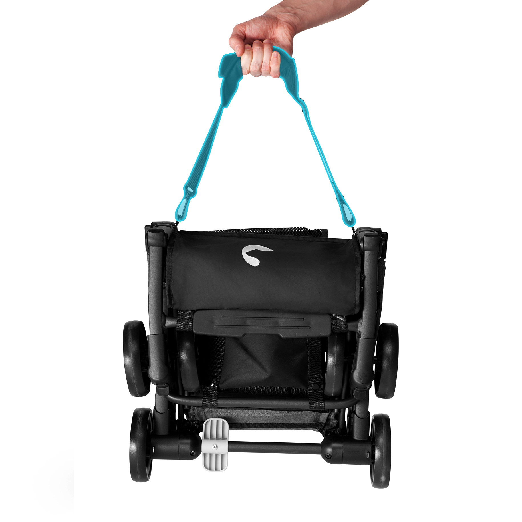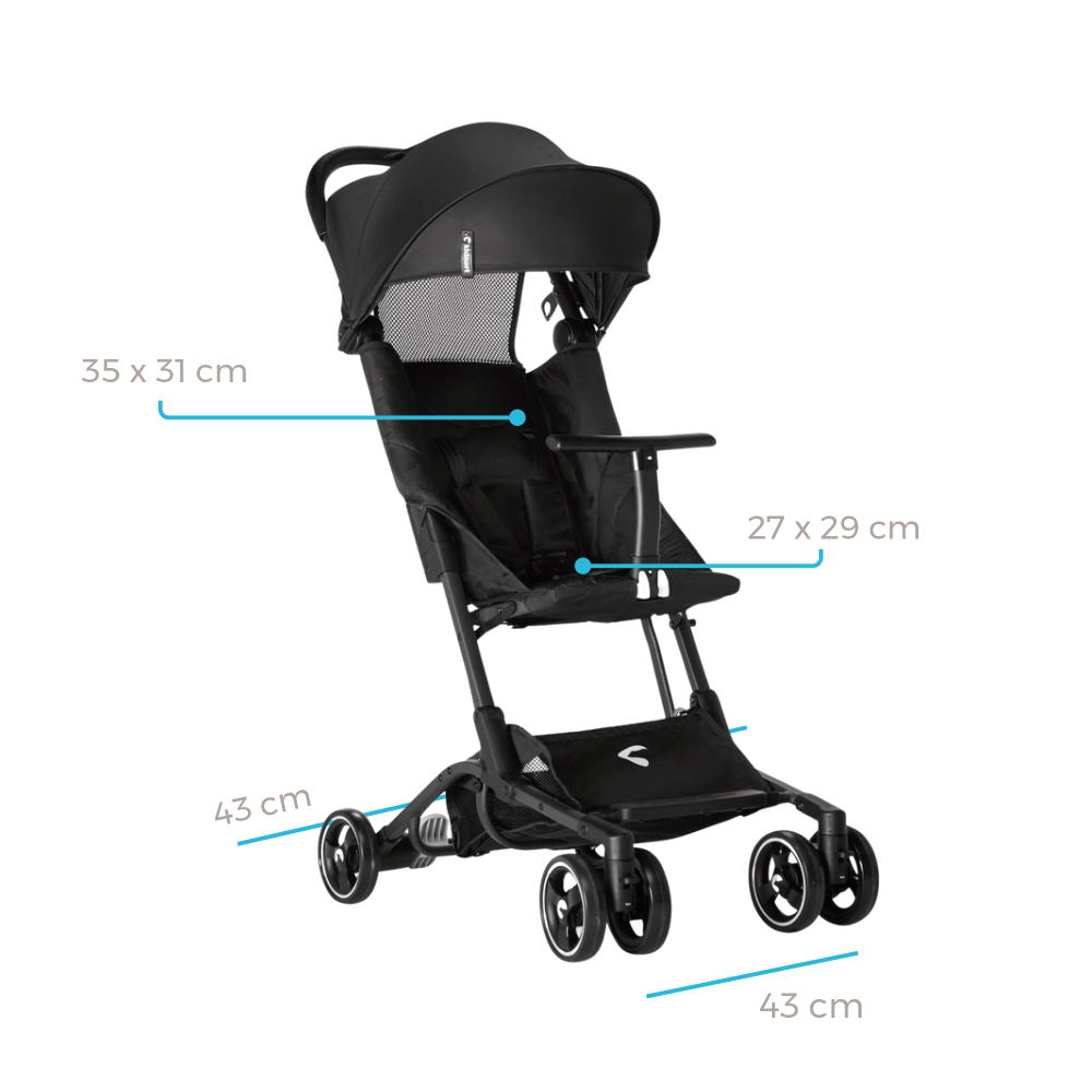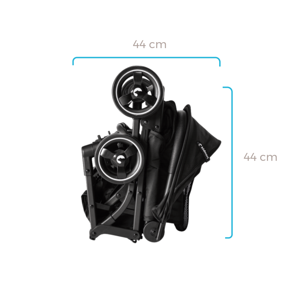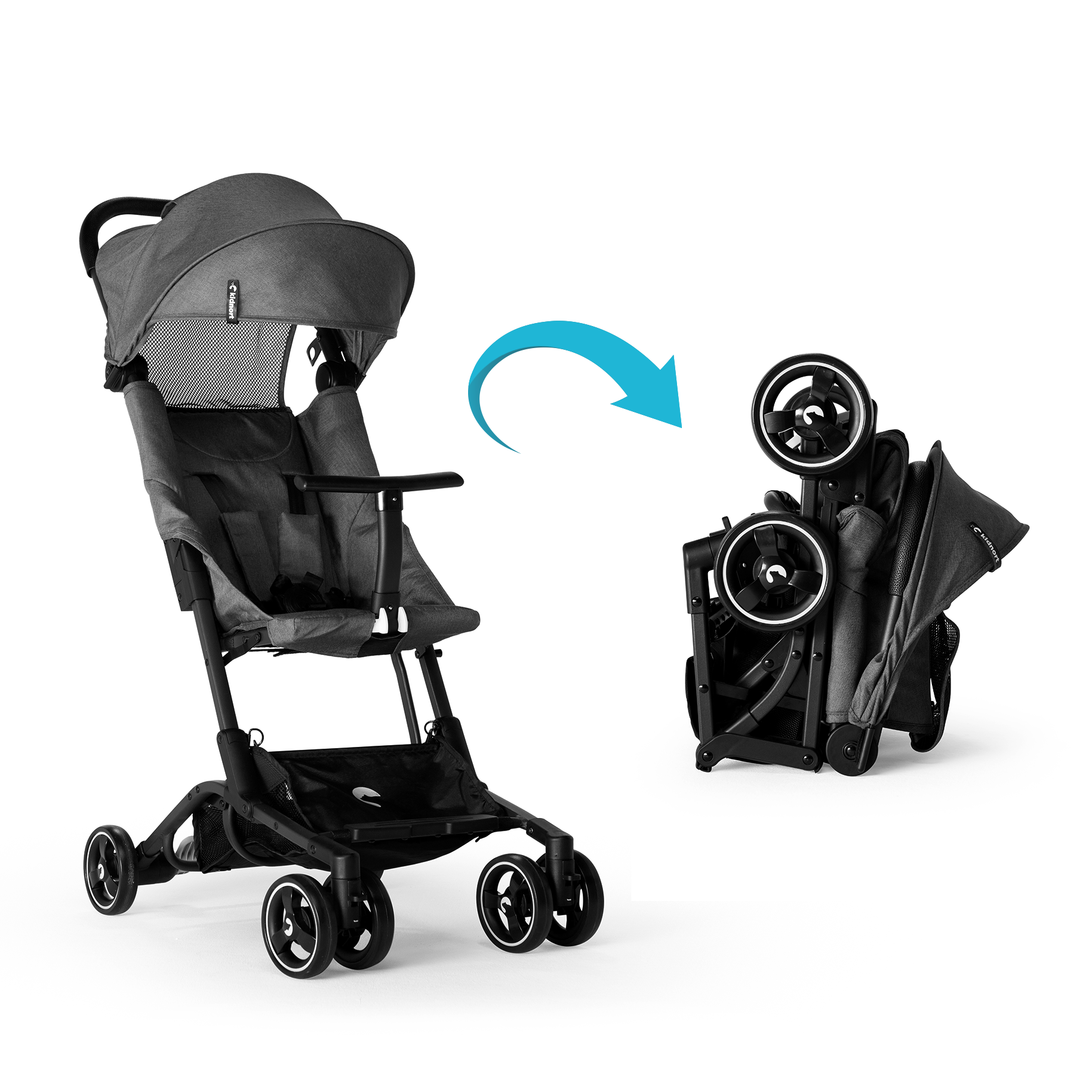 Velmi jednoduché a rychlé složení kočárku. Kompaktní rozměry před i po složení. Ideální na cesty. Kočárek má přídavný ramenní popruh pro snadnou přepravu.