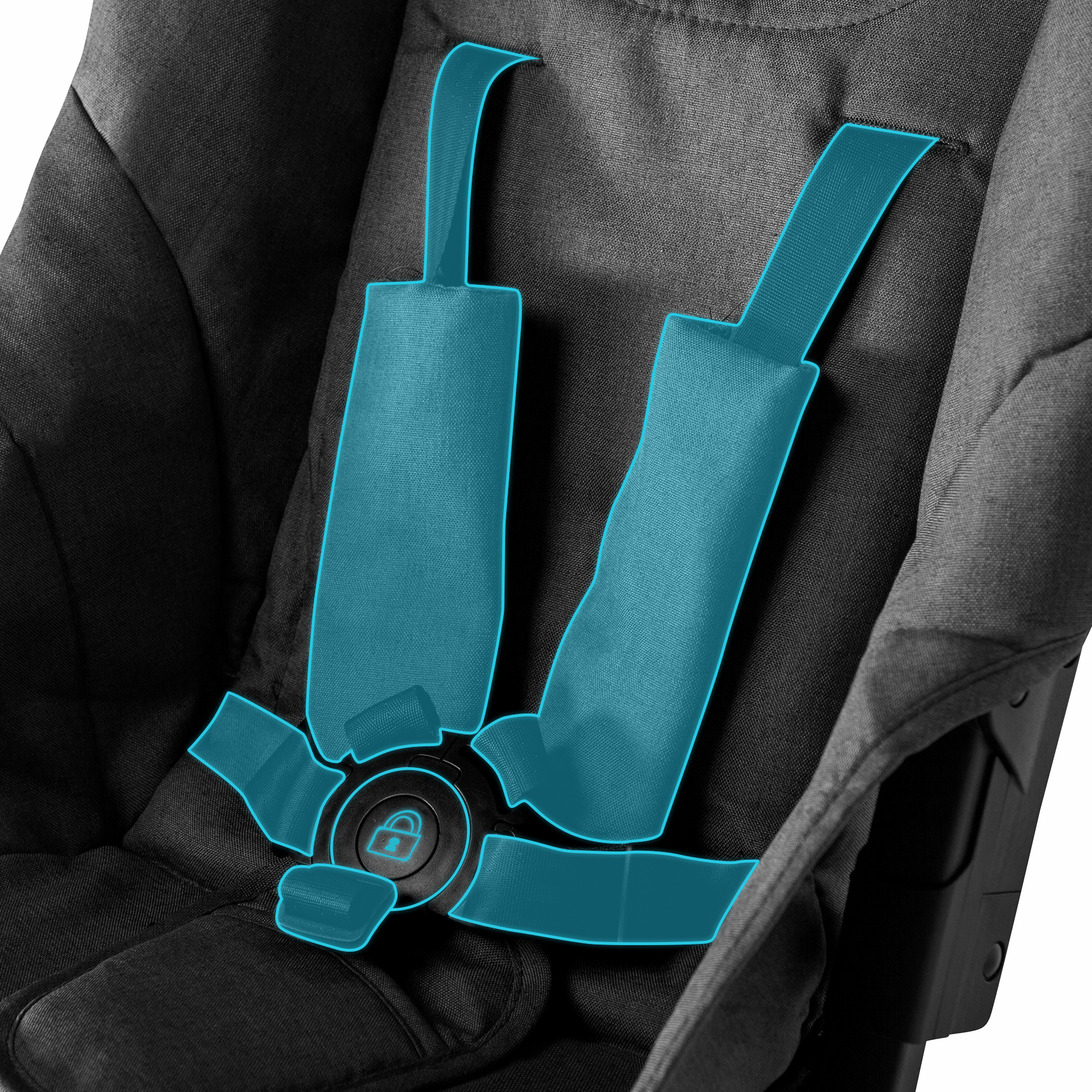 Kočárek Snöpetrel má 5-ti bodový bezpečnostní pás. Délku pásů a výšku uchycení postrojů lze nastavit. Díky tomu je můžete přizpůsobit výšce dítěte.